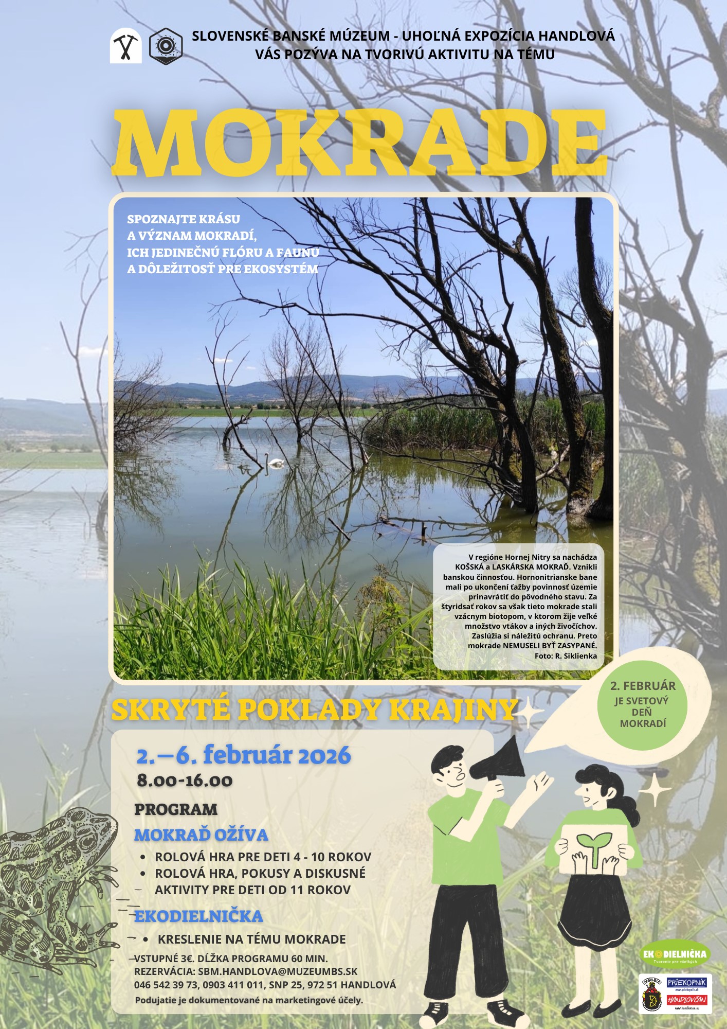 Slovenské banské múzeum pozýva školy aj širokú verejnosť na vzdelávacie podujatie „Mokrade – skryté poklady krajiny“, ktoré sa uskutoční pri príležitosti Svetového dňa mokradí v termíne od 2. do 6. februára 2026. Podujatie bude prebiehať v priestoroch Uhoľnej expozície v Handlovej a ponúkne návštevníkom jedinečný pohľad na význam mokradí v krajine aj ich prepojenie s banskou históriou Slovenska.