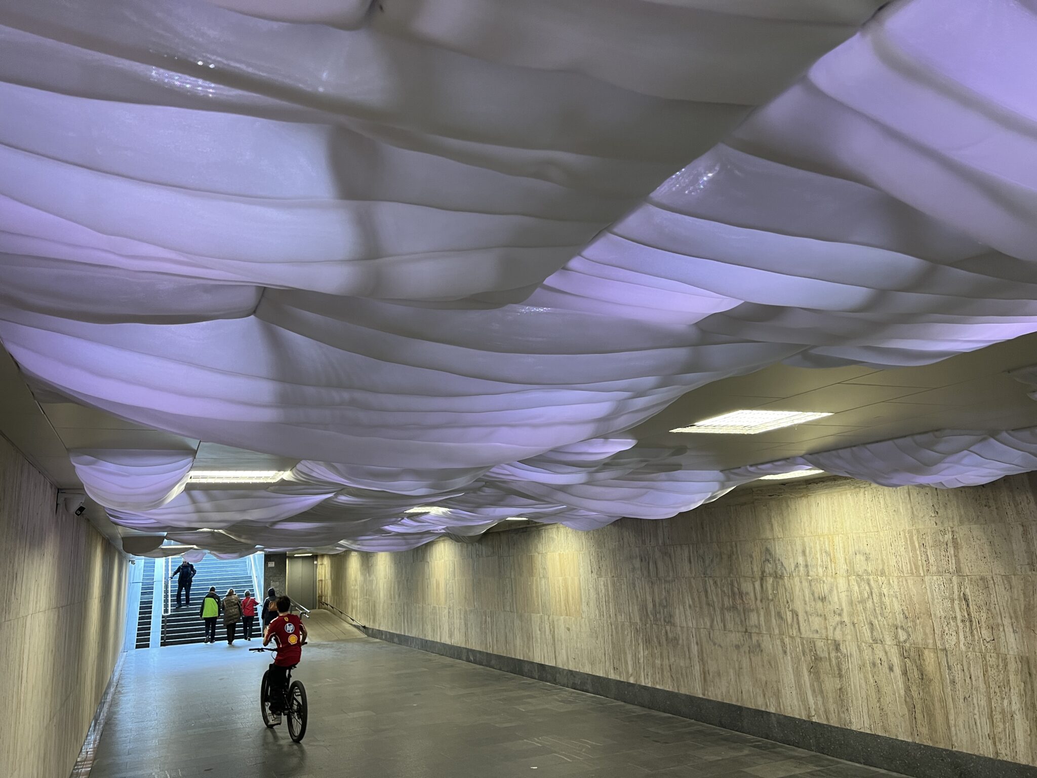 Podchod, ktorý denne využívajú stovky ľudí pri presune medzi železničnou a autobusovou stanicou a centrom mesta, dostal úplne nový vizuálny charakter. Dominantným prvkom sa stala unikátna umelecká inštalácia v podobe zavesenej 3D textilnej membrány. Tá vytvára nad hlavami chodcov jemný, oblak pripomínajúci strop, ktorý reaguje na svetlo a pohyb.
